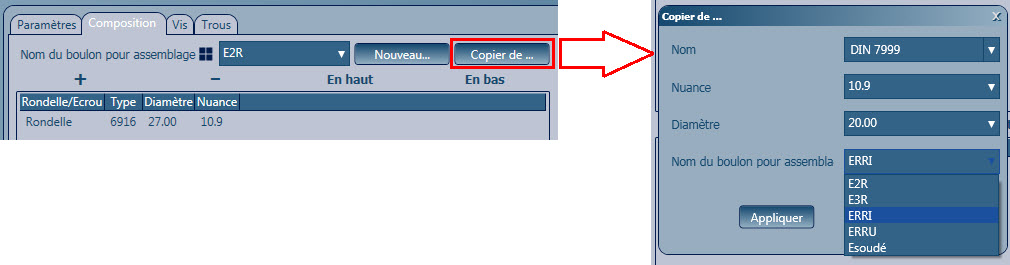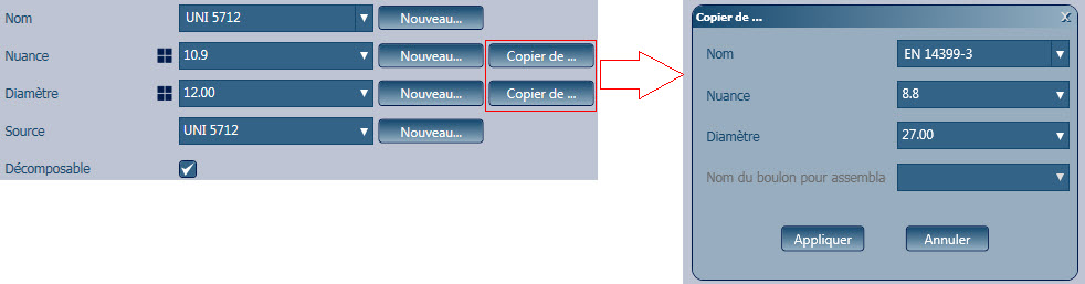 Remarque : Vous pouvez également utiliser certains paramètres (tels que la classe ou le diamètre) d'autres boulons déjà créés, en utilisant le bouton Copie de... :