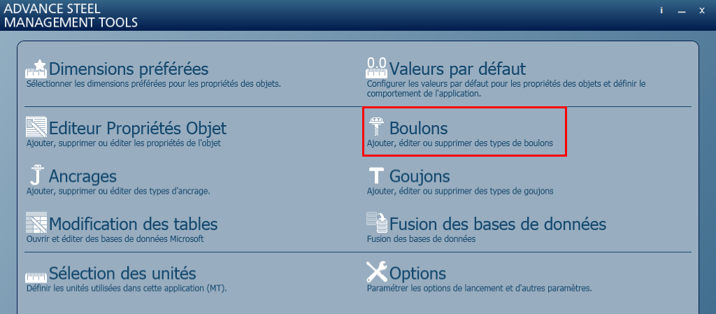 - Ouvrez l'application Management Tools et accédez à la catégorie Boulons :