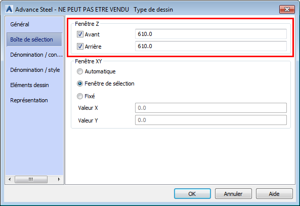 - La fenêtre Type de dessin s'ouvre dans l'onglet Boîte de sélection et vous pouvez rechercher les paramètres de profondeur Z.