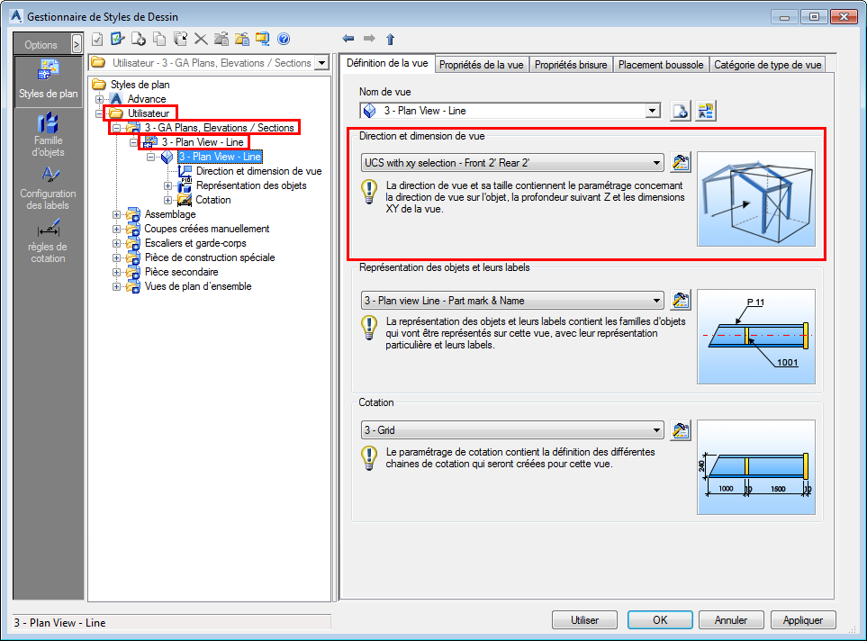 - Dans le Gestionnaire de styles de dessin > catégorie Utilisateur > Plans GA, Elévations / Coupes. Accédez au gestionnaire de styles de dessin à partir de l'onglet