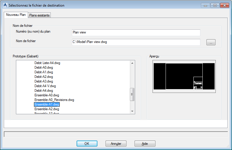 - Après avoir sélectionné le style de dessin, la fenêtre Sélectionner le fichier de destination s'ouvre. Nommez votre plan, choisissez un prototype et cliquez sur OK.