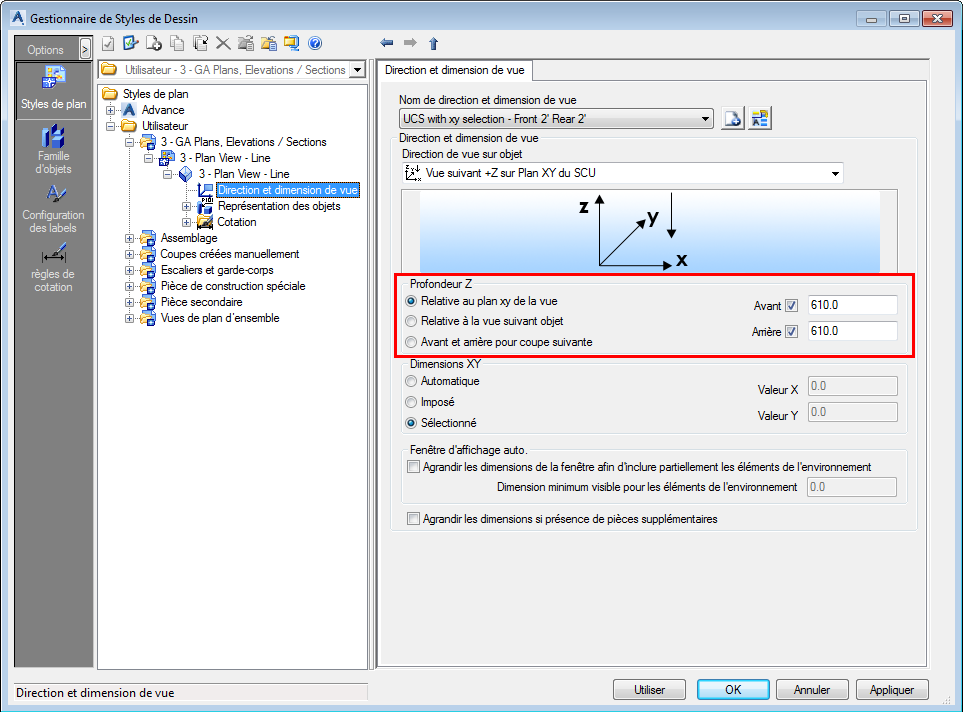 - L'onglet Direction et dimension de vue s'ouvre et vous permet de rechercher les paramètres de profondeur Z.