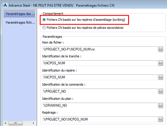 - Le scribing est obtenu uniquement pour les pièces principales. Dans la boîte de dialogue Paramètres CN, le comportement doit être défini sur Fichiers CN basés sur les repères d'assemblage (scribing).