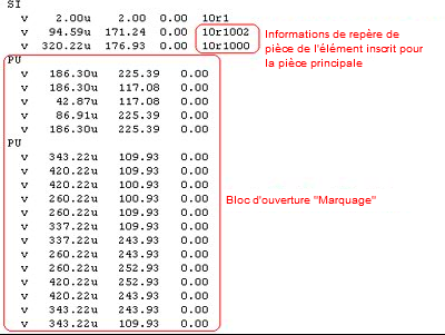 Les informations de scribing s'affichent dans le fichier NC dans le bloc appelé PU (scribing) ou KO (marquage) en fonction de la valeur par défaut de Fichier CN - Mode d'affichage des contours des pièces assemblées. La différence entre les noms de blocs sera reconnue par la machine NC, car les informations dans le bloc sont identiques dans les deux cas.