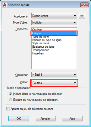 Tous les éléments dans le calque "Poutres" sont sélectionnés.