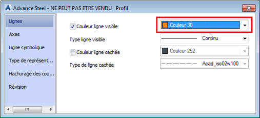 - Modifiez la "Couleur ligne visible", par exemple, sur "Orange" (couleur 30), puis appuyez sur la touche Entrée.
