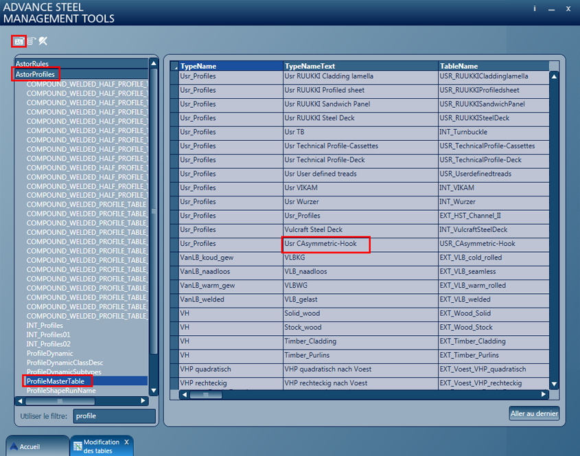- Dans ProfileMasterTable, à partir de la copie de colonne TypeNameText, copiez le nom interne affecté à la coupe utilisateur (Usr CAsymmetric-Hook).