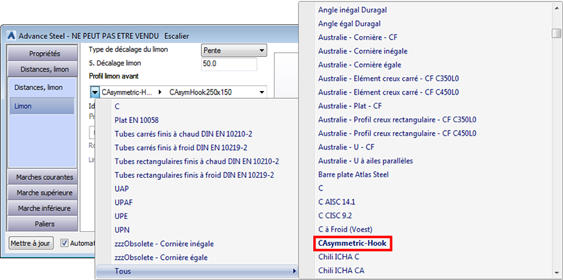 Créez un assemblage Escalier dans Advance Steel et dans les propriétés, choisissez la coupe utilisateur précédemment définie.