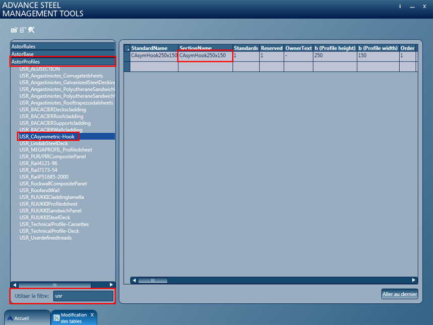 - La colonne DefaultProfile doit être renseignée comme suit : "Usr CAsymmetric-Hook#@§@#CAsymHook250x150" où "Usr CAsymmetric-Hook" est le nom interne de la coupe de la table "ProfileMasterTable" de la base de données AstorProfiles ; "#@§@#" est un séparateur unique qui est utilisé pour ajouter une nouvelle coupe ; "CAsymHook250x150" est le nom de la coupe de la table de définition du profil "USR_ CAsymmetric-Hook" de la base de données.