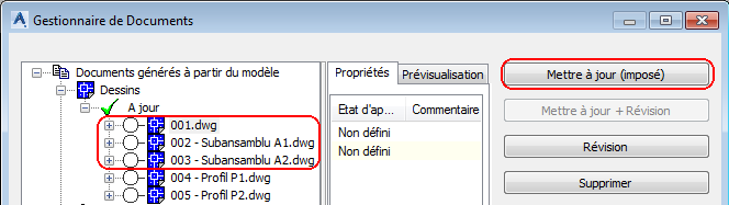 Dans ce cas, dans le Gestionnaire de documents, le statut des détails sera mis à jour uniquement si des modifications ont été apportées dans le modèle.