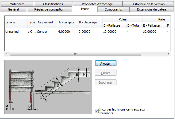 Cette procédure permet d'inclure des limons dans le style d'escalier. Un style d'escalier peut comporter un ou plusieurs limons. Vous pouvez définir les propriétés de chaque limon. Si le style utilise des limons, vous pouvez spécifier la profondeur de la paillasse au niveau des volées et des paliers. Vous pouvez également créer des limons centraux comportant des coins à onglet ou incurvés au niveau des tournants de palier. Pour les limons de type rampe ou à la française, vous pouvez également indiquer la profondeur totale au niveau des volées et des paliers.