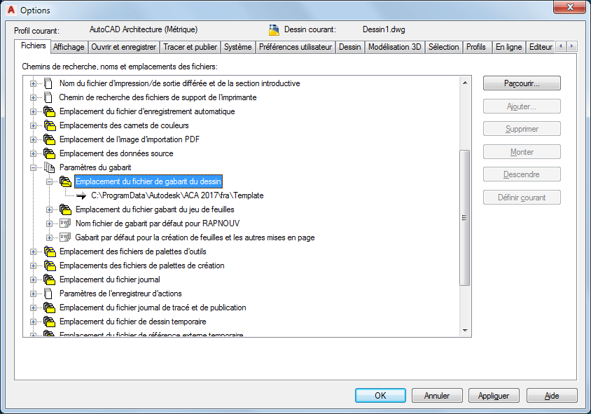 Configuration de l'emplacement du fichier de gabarit dans la boîte de dialogue Options