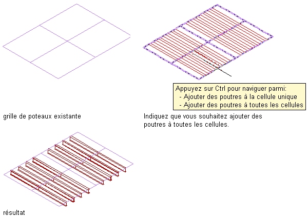 | ajouter une poutre le long d'un ou plusieurs segments d'une grille de poteaux (lorsque le type de positionnement correspond à Bord) | déplacez le pointeur sur un segment de la grille afin d'afficher un aperçu de la poutre, puis cliquez pour ajouter une poutre le long de ce segment ou appuyez sur la touche Ctrl et cliquez pour ajouter des poutres le long de tous les segments de cette ligne de grille ou appuyez sur la touche Ctrl à deux reprises pour ajouter des poutres le long de tous les segments de la grille. Appuyez sur Entrée pour mettre fin à la commande. |