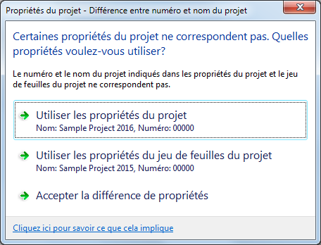 | continuer à utiliser des noms différents pour le projet et le jeu de feuilles du projet | sélectionnez Accepter la différence de propriétés. |