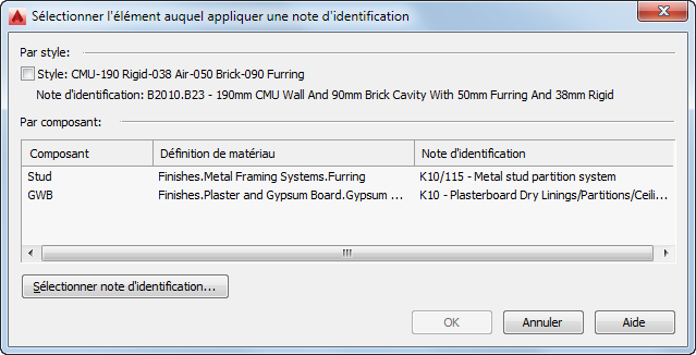 | une ou plusieurs notes d'identification sont déjà associées au style d'objet ou aux définitions de matériaux des composants des objets sélectionnés |