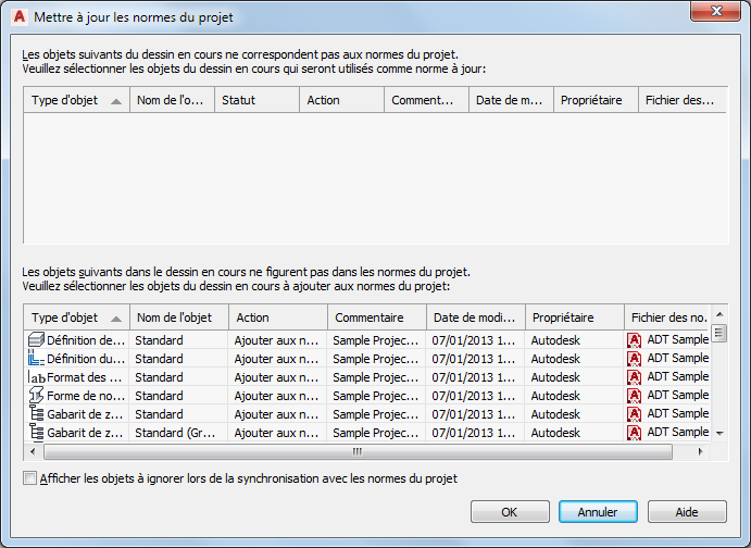 L'objet en question ne sera plus pris en compte lors des prochaines synchronisations, sauf si vous cochez la case Afficher les objets à ignorer lors de la synchronisation avec les normes du projet ou supprimez l'indicateur Ignorer du style ou du paramètre d'affichage dans le Gestionnaire des styles ou dans le Gestionnaire d'affichage.