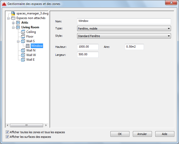 Dans le cas des espaces 3D de forme libre, l'aire rapportée est affichée avec l'aire globale. Lorsqu'une partie seulement de l'ouverture se situe sur la surface, l'autre partie résidant sur une autre surface ou en dehors de l'espace, l'aire rapportée est différente de l'aire globale. Dans ce cas, l'aire rapportée concerne la partie de l'ouverture qui se situe sur la surface. La valeur de l'aire rapportée est en lecture seule. |