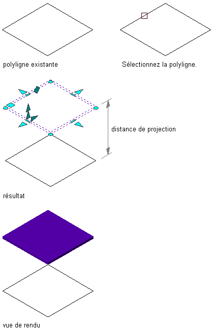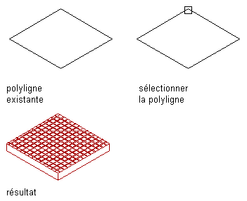 Lorsque vous tapez p (Projeté), vous êtes invité à entrer la hauteur de base de la dalle ou de la dalle de toit. Les coordonnées X, Y du premier sommet de la polyligne sont projetées sur une valeur Z de la hauteur de base actuelle. Ceci établit le point d'insertion.