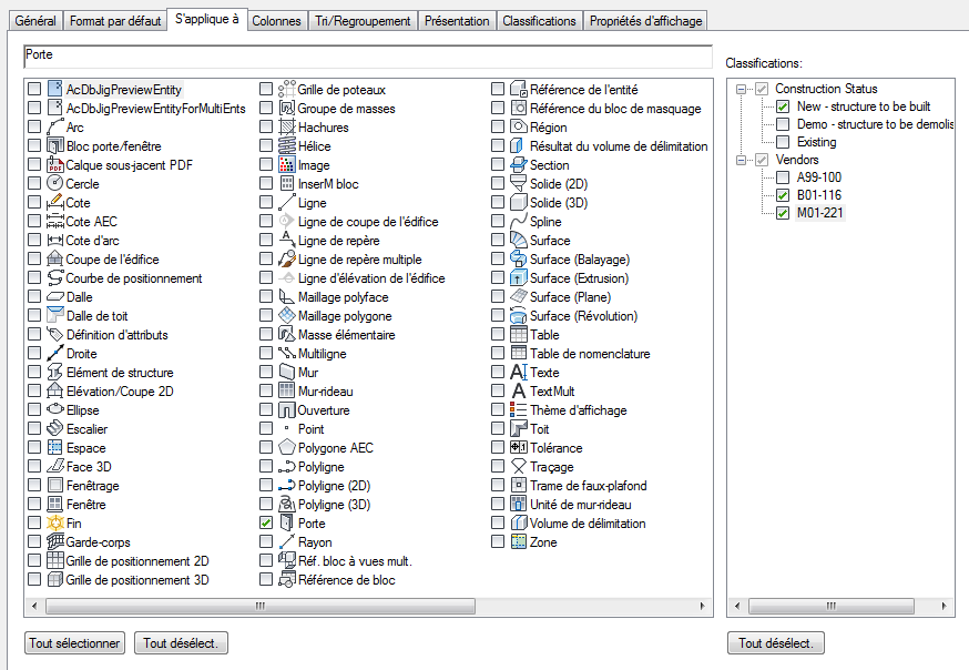 Si, par exemple, vous souhaitez répertorier dans une nomenclature uniquement les portes dont la classification de construction indique Nouveau et pour lesquelles un fournisseur préféré a été spécifié, vous pouvez préciser ces critères dans le style de table de nomenclature. Seules les portes répondant à ces deux critères peuvent être incluses dans la table de nomenclature.