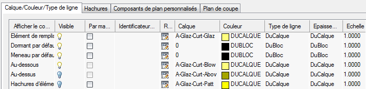Cette procédure permet de spécifier les propriétés d'un ou plusieurs plans de coupe pour un style de mur-rideau. Les propriétés d'affichage du plan de coupe n'apparaissent que dans des représentations d'affichage (Plan, par exemple) qui sont utilisées dans des vues de dessus (vues en plan) d'un dessin.