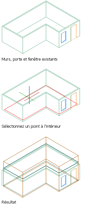 Dans certains cas, vous pouvez vous baser sur le contour d'un objet d'un dessin pour générer un espace associatif de type 2D ou 3D extrudé. Ce contour d'objet délimite alors le nouvel espace. Si vous générez, par exemple, des espaces à partir de contours de murs, ce sont les contours des murs qui servent à délimiter les espaces.