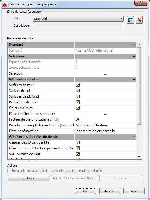- Tous les paramètres définis dans cette boîte de dialogue (sélection, intervalle, exportation) sont enregistrés dans le style actif de calcul des quantités par pièce. Les paramètres de calcul, cependant, ne sont pas conservés dans le style, mais de façon globale dans le dessin. Au besoin, vous devez les changer avant de procéder à un nouveau calcul.