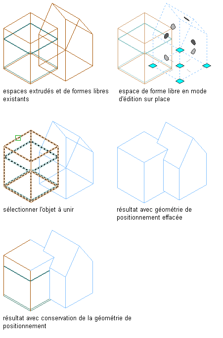 Cette procédure permet de fusionner un espace 3D de forme libre avec un espace ou un autre objet AEC. Vous pouvez fusionner un espace 3D de forme libre avec tous les objets AEC dotés d'une géométrie 3D.