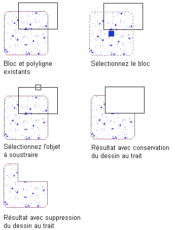 Cette procédure permet de soustraire une partie sélectionnée d'un dessin au trait, de polygones AEC, d'extrusions de masses élémentaires, d'espaces ou d'un bloc contenant ce type d'objet, sans avoir à retracer aucun des composants restants. Vous pouvez également spécifier les angles d'un rectangle pour la soustraction. La partie à soustraire peut contenir ou être délimitée par des lignes, des polylignes (ouvertes ou fermées), des arcs, des cercles, du texte ou des hachures. Si la soustraction supprime une partie d'une polyligne fermée, la polyligne recréée est également fermée. Si la soustraction divise une polyligne fermée en deux parties égales, ces dernières sont recréées sous forme de polylignes fermées. Toutefois, si la soustraction divise des hachures en deux parties égales, les hachures obtenues forment elles aussi une entité de dessin au trait unique, que vous pouvez sélectionner en cliquant sur l'une des deux parties.