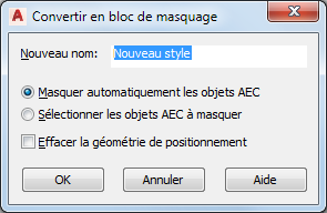 - Pour sélectionner les objets AEC existants afin qu'ils soient masqués par le nouveau bloc de masquage, vérifiez que l'option Sélectionner les objets AEC à masquer est sélectionnée.