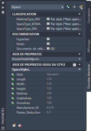 Si des jeux de propriétés spécifiques aux styles et aux objets sont associés à l'objet, ces deux types de jeux sont affichés dans l'onglet Données étendues.