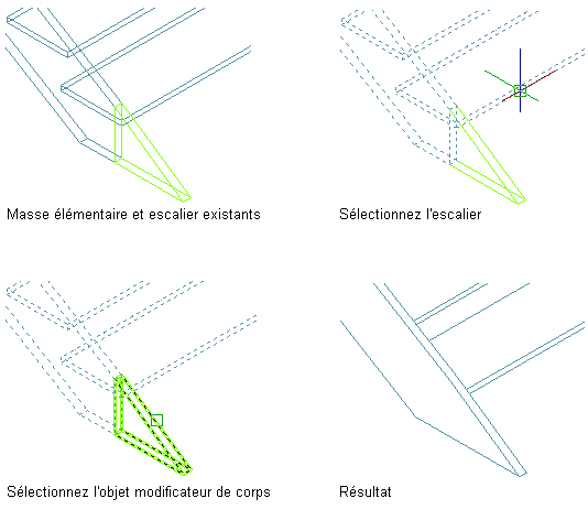 L'illustration suivante décrit l'utilisation d'une masse élémentaire comme modificateur de corps afin d'ajouter un composant de limon d'escalier.
