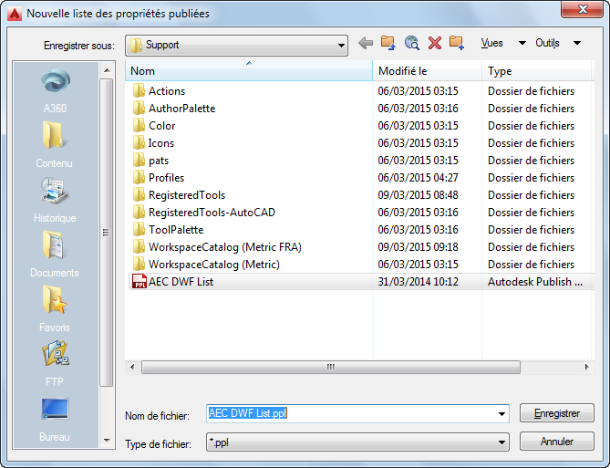Cette procédure permet de créer une liste des propriétés publiées (PPL) répertoriant les définitions de jeux de propriétés du fichier DWG qui seront exportées au format DWF ou DWFx, excepté celles qui ont été ajoutées à des objets ou à des styles du dessin.