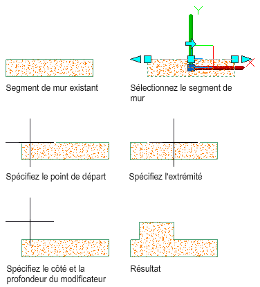 Cette procédure permet d'ajouter un modificateur de mur d'un style existant à un mur. Vous pouvez appliquer le modificateur à un des côtés ou aux deux côtés du mur ou du composant. Les côtés gauche et droit du mur sont déterminés à partir de son point de départ et de son extrémité.