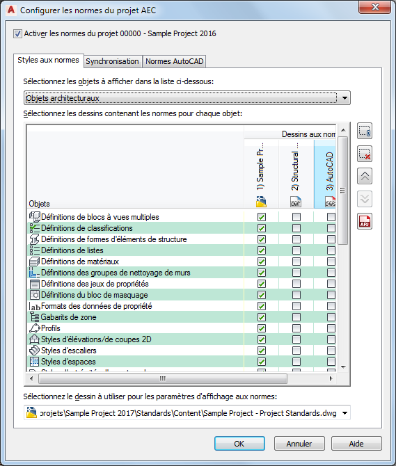 Les types de style associés à aucun dessin aux normes ne dépendent pas des normes. Si vous omettez, par exemple, d'associer le dessin aux normes "Standard Styles 1.dwg" au type Styles de murs, l'opération de synchronisation considère que les styles de murs utilisés dans le cadre du projet ne sont pas normalisés même s'ils proviennent de ce dessin aux normes.