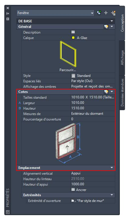 au dormant intérieur sélectionnez Intérieur du dormant dans la zone Mesures de.