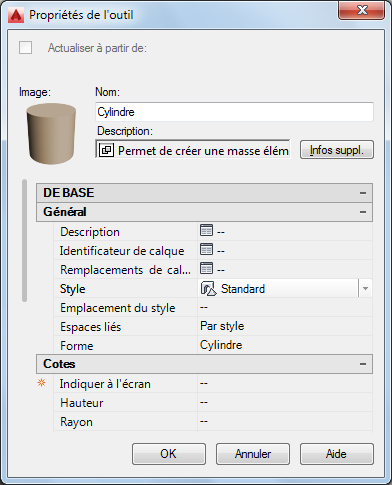 Propriétés d'un outil de style de masse élémentaire. Notez que le nom de l'outil est plus descriptif. En outre, la masse élémentaire créée par cet outil devant définir un poteau décoratif classé en tant que mur extérieur, l'auteur de l'outil a placé la masse élémentaire sur le calque défini par l'identificateur MUR du style d'identificateur de calque en cours. Dans l'exemple, la forme de la masse élémentaire a également été prédéfinie comme matériau cylindrique puisque, encore une fois, elle est destinée à définir un type d'objet spécifique plutôt qu'une affectation de matériau en particulier.