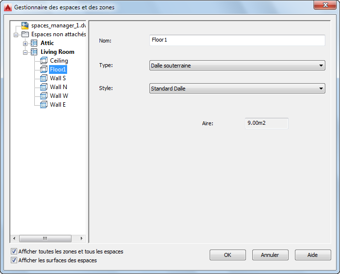 . Pour afficher tous les espaces dans le dessin, ainsi que leurs surfaces et les ouvertures de surface, vérifiez que les options Afficher toutes les zones et tous les espaces et Afficher les surfaces des espaces sont sélectionnées.
