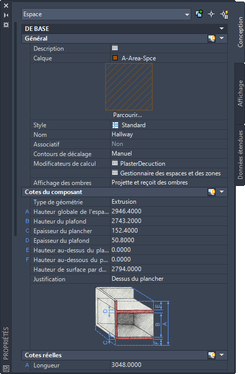 - Pour appliquer le modificateur aux contours net, utilisable et brut d'un espace, prévoyez une définition de jeu de propriétés contenant des propriétés pour les valeurs d'aire et de périmètre calculées des contours en question.