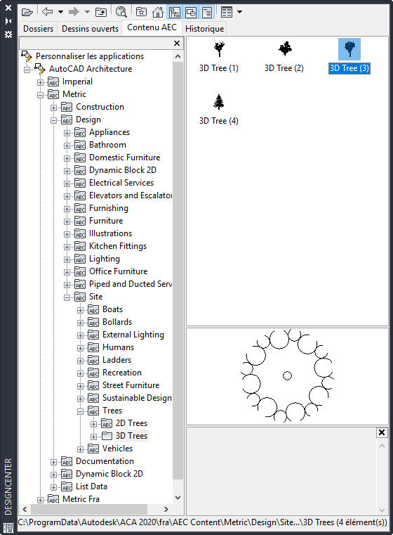 A l'instar du Navigateur de contenu, DesignCenter permet de stocker, d'organiser, de partager et d'échanger du contenu AEC pouvant être inséré dans des dessins. Le contenu AEC dans DesignCenter n'est pas basé sur les outils, mais organisé dans une arborescence. Lorsque vous sélectionnez un élément de contenu AEC, vous pouvez en afficher un aperçu, le modifier ou le faire glisser d'une palette d'outils directement jusqu'à un dessin.