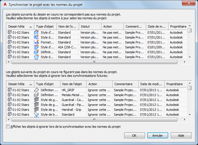 Lorsque vous synchronisez un projet ou un dessin en fonction des normes de projet AEC auxquelles il est associé, les styles et les paramètres d'affichage des dessins de projet sont comparés aux versions des dessins aux normes. Si la version du style ou du paramètre d'affichage dans le dessin de projet n'est pas identique à celle du dessin aux normes, plusieurs actions sont possibles pour le style ou le paramètre d'affichage.