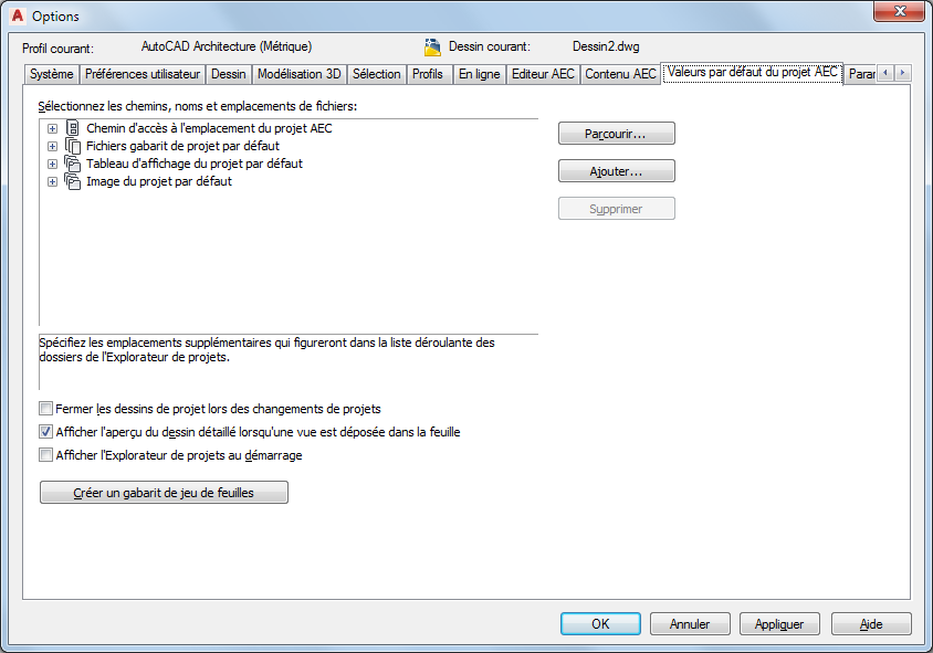Spécification des options des valeurs par défaut du projet AEC pour le dessin en cours