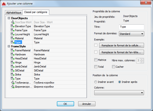 Chaque colonne contient les valeurs d'une propriété du jeu de propriétés. Les définitions de jeux de propriétés pour les propriétés que vous spécifiez doivent déjà exister dans le dessin pour que vous puissiez créer les colonnes correspondantes.
