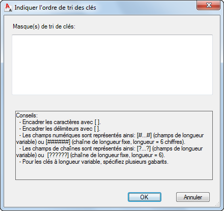- Dans la boîte de dialogue Indiquer l'ordre de tri des clés, entrez un masque de tri de clés pour chaque motif de clé dans la base de données sélectionnée. Utilisez une ligne différente pour chaque masque.