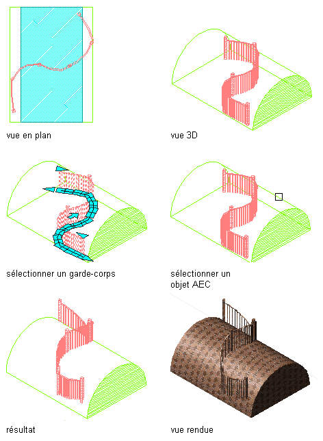 Cette procédure permet d'ancrer un garde-corps existant à un objet AEC qui n'est pas un escalier. Une fois ancré, le garde-corps conserve son emplacement dans le dessin mais il accompagne le déplacement de l'objet attaché. Ceci vous permet de créer des trajets de forme libre pour un garde-corps le long d'un escalier ou d'un autre objet.