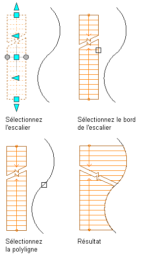 Cette procédure permet de projeter le côté d'un escalier sur une polyligne, un mur, une forme solide ou un objet AEC existant. Les objets vers lesquels s'opère la projection doivent s'étendre sur toute la longueur de l'escalier pour obtenir une bonne projection d'un angle interne.