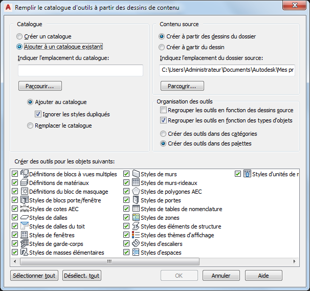 Remarque : Si les deux options sont activées, les outils sont d'abord classés en fonction des dessins, puis par type d'objet. Dans ce cas, les catégories proviennent des dessins et les palettes des types d'objets. En effet, les palettes ne peuvent pas être imbriquées. Les boutons radio sont désactivés et l'option Créer des outils dans des palettes est sélectionnée pour le catalogue.