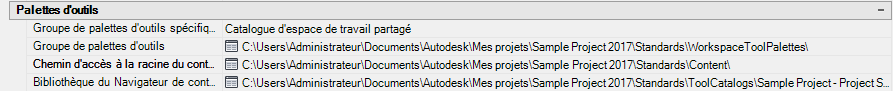 Si vous choisissez Catalogue d'espace de travail partagé, le chemin sélectionné pour la propriété Groupe de palettes d'outils est ajouté à votre profil de projet (AWS) et le catalogue d'outils est accessible à partir de l'emplacement indiqué. Si vous choisissez Catalogue d'espace de travail spécifique à l'utilisateur, le programme crée un dossier sous C:\My Documents\Autodesk\My Projects\<nom du projet> et copie les palettes d'outils dans ce dossier. Si vous sélectionnez Aucun, le groupe de palettes d'outils spécifiques au projet est désactivé pour ce projet et les autres propriétés répertoriées sous Palettes d'outils ne s'affichent pas.