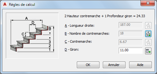 Certaines des cotes concernées peuvent être définies par l'utilisateur. D'autres sont définies de façon automatique. Cela dépend, en fait, de la combinaison des champs sélectionnés. Seules les combinaisons logiques sont disponibles lorsque le calculateur basé sur la règle est mis en service. Lorsque le calculateur basé sur la règle n'est pas en service, vous pouvez définir soit le giron, soit la longueur droite et soit le nombre de contremarches, soit la hauteur des contremarches.