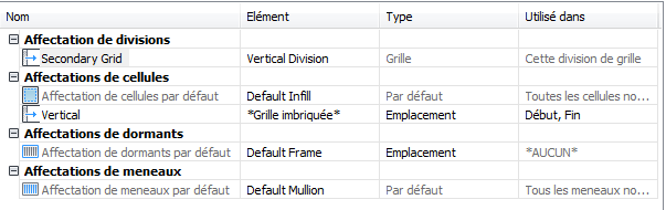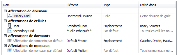 Chaque grille est dotée de ses propres affectations de cellules. Les affectations de cellules peuvent être définies pour inclure dans les cellules une autre grille, un élément de remplissage de panneau ou un objet tel qu'une fenêtre ou une porte.
