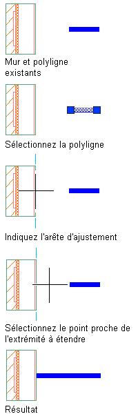 Cette procédure permet de prolonger précisément des lignes, des polylignes ouvertes ou des arcs jusqu'au bord implicite d'un segment droit ou en arc d'un objet ou jusqu'à l'extension implicite de ce segment.